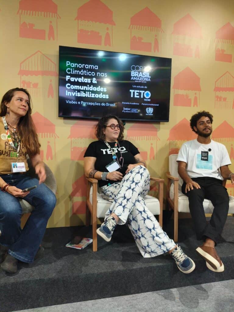 Camila Jordan, directora de Relaciones Institucionales de TETO Brasil, presentó los resultados del estudio Panorama Climático das favelas e comunidades invisíveis, que relevó las percepciones de habitantes y liderazgos comunitarios en 119 favelas y comunidades. Los datos lo demuestran: el cambio climático ya está presente en la vida cotidiana de miles de familias.